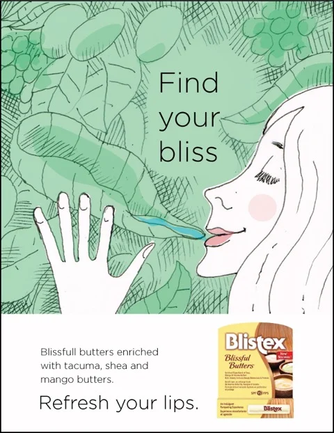 The copy at the top of the ad, “Pamper your lips,” and the company tagline, “There’s no bliss like Blistex,” both establish the esteem-value of the product. This is meant to be a relaxing treatment of sorts, possibly even something more lavish. They further this idea with spa imagery. The model has a relaxed look on her face while seemingly awaiting a massage. The wooden slat flooring where the product and ingredients are displayed also bring to mind a spa. In this way, the message of the ad is that Blissful Butters lip balm is a way to treat oneself. It refreshes and rejuvenates a person, in the same way that a day at the spa would. It's also noteworthy that, though she is wearing makeup, her lips are not made to stand out. They are a natural shade, as if the only thing on them, and thus the source of their natural look, is the product.